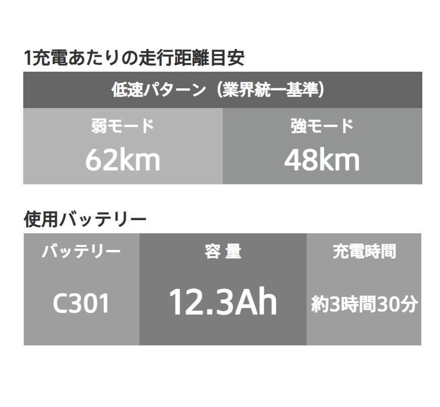 1充電あたりの走行距離の目安:(標準パターン・バッテリー新品時)