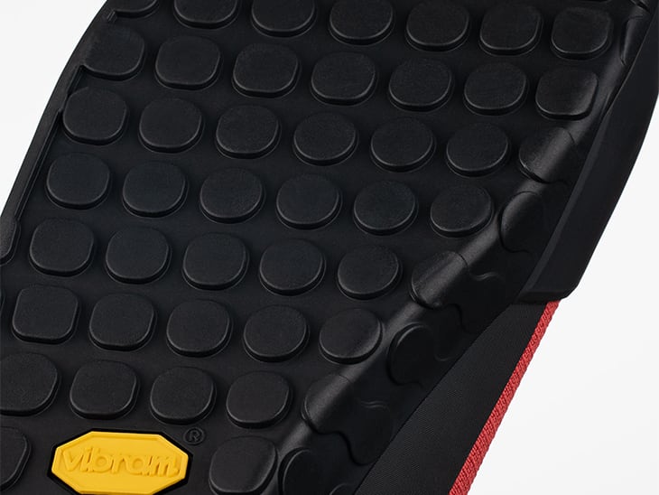 中央部はやや薄く、踵とつま先部分はより深いトレッドにすることでハイク時のグリップも高めています。このフラットバージョンはよりしなやかにペダルをとらえつつ、最大限のグリップを稼ぐことが可能です。