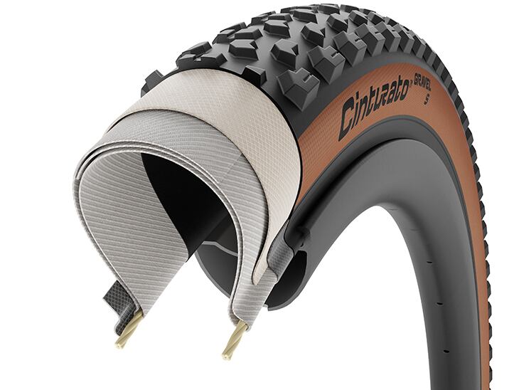 TECH WALL GRAVEL:高強度のナイロン生地でタイヤ全体を覆い、耐カット性と耐パンク性を向上させる構造。グラベルタイヤ専用設計。