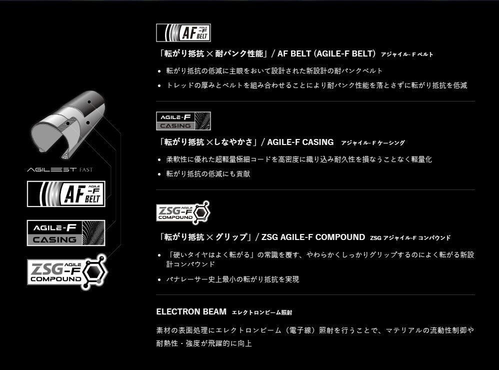 【AF BELT (AGILE-F BELT)(アジャイル- F ベルト)】 「転がり抵抗 X 耐パンク性能」 ・転がり抵抗の低減に主眼をおいて設計された新設計の耐パンクベルト ・トレッドの厚みとベルトを組み合わせることにより耐パンク性能を落とさずに転がり抵抗を低減 【AGILE-F CASING(アジャイル- F ケーシング)】 「転がり抵抗 X しなやかさ」 ・柔軟性に優れた超軽量極細コードを高密度に織り込み耐久性を損なうことなく軽量化 ・転がり抵抗の低減にも貢献 【ZSG AGILE-F COMPOUND(ZSG アジャイル-F コンパウンド)】 「転がり抵抗 X グリップ」 ・「硬いタイヤはよく転がる」の常識を覆す、やわらかくしっかりグリップするのによく転がる新設計コンパウンド ・パナレーサー史上最⼩の転がり抵抗を実現 【ELECTRON BEAM(エレクトロンビーム照射)】 素材の表面処理にエレクトロンビーム(電子線)照射を行うことで、マテリアルの流動性制御や耐熱性・強度が飛躍的に向上